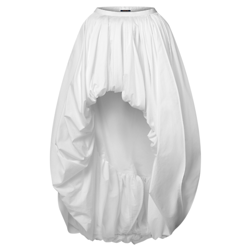 กระโปรงชิ้นโดดเด่นที่สะท้อนถึงความหรูหราของรันเวย์คอลเลกชัน ดีไซน์รูปทรงบอลลูนพลิ้วไหวโอบรับสรีระงดงาม โดดเด่นด้วยชายกระโปรงแบบอสมมาตรด้านยาวถึงระดับต้นขาและด้านหลังทอดยอดถึงข้อเท้า กระโปรงรังสรรค์จากผ้าคอตตอนป๊อปลินเนื้อบางเบา โปร่งสบาย มาพร้อมดีไซน์กระดุมและซิปแบบซ่อนด้านข้างอย่างประณีต