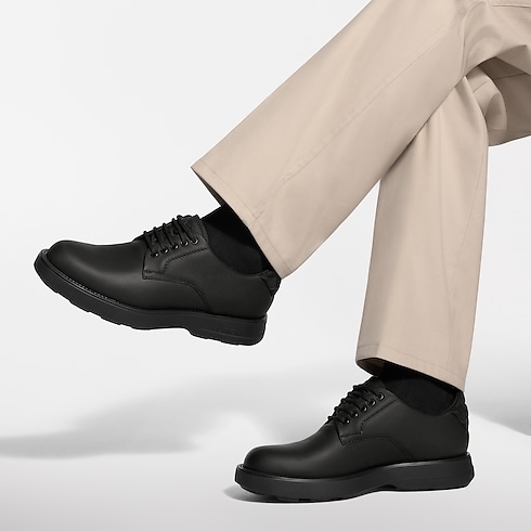 รองเท้าดาร์บี้รุ่น Bastille รังสรรค์จากหนังลูกวัว Aerogram ซึ่งเป็นเอกลักษณ์ประจำงานเครื่องหนังหลุยส์ วิตตอง โดดเด่นด้วยผิวสัมผัสละเอียด เนื้อแมตต์ และความทนทานเป็นเลิศ ส่วนบนประดับเชือกผ้าทรงกลมและแถบตกแต่งนีโอพรีนลาย Damier ที่ด้านหลัง รุ่นนี้มาพร้อมพื้นรองเท้ายางด้านนอกทรงหนาแต่น้ำหนักเบา พร้อมประทับสัญลักษณ์ Vuitton ที่ด้านข้างอย่างสง่างาม