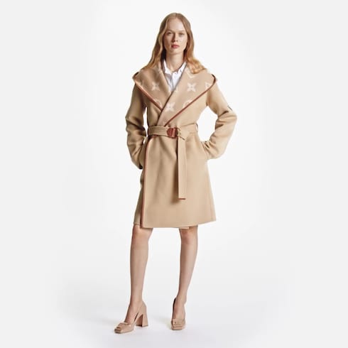 เสื้อโค้ทแบบป้ายมีฮู้ดอุ่นสบาย ไอเท็มสุดไอคอนิกจากหลุยส์ วิตตองรังสรรค์จากผ้าวูลผสมผ้าไหมด้วยเทคนิคพิมพ์สองด้านอย่างประณีต ด้านในแต่งลาย Giant Monogram มาพร้อมเข็มขัดอันเป็นเอกลักษณ์ประจำฤดูกาลเพื่อขับเน้นทรวดทรงอันสง่างามแบบเฟมินีน คอมพลีตลุคด้วยแพตช์หนังที่แขนเสื้อเพิ่มสัมผัสแห่งเมซงได้อย่างลงตัว