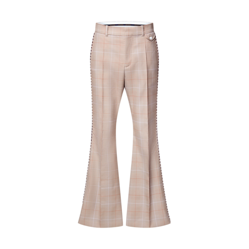 กางเกงขาบานจากรันเวย์ประจำฤดูกาล Spring-Summer 2026 ถ่ายทอดความงามแห่งสไตล์ Dandy แบบอินเดียได้อย่างสมบูรณ์แบบ ตัดเย็บอย่างประณีตจากผ้าวูลลายตารางในโทนสีน้ำตาล Camel หรูหรา พร้อมประดับลูกปัดปักอย่างวิจิตรบนตะเข็บขากางเกง เสมือนเครื่องประดับอัญมณี ด้านหลังแต่งสัญลักษณ์ Louis Vuitton Paris โทนเดียวกันเสริมเอกลักษณ์ เมื่อสวมคู่กับเสื้อแจ็คเก็ตแบบเดียวกันจะสร้างลุคชุดสูทที่สะกดทุกสายตา