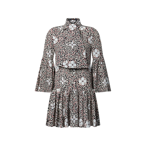 เดรสผ้าไหม crepe de chine เรียบหรูโดดเด่นด้วยลายกราฟิกแสนประณีตและอ่อนโยน ผสานความโรแมนติกของลายพิมพ์ botanical แต่งแต้มสัญลักษณ์ Monogram Flower อันเป็นเอกลักษณ์มีระดับ เดรสทรงตรงตัดเย็บโดยช่างฝีมือ จับจีบเพิ่มวอลลุ่มรอบแขนเสื้อรับกับกระโปรงพลิ้วไหวและเนคไทสไตล์ lavallière งดงาม