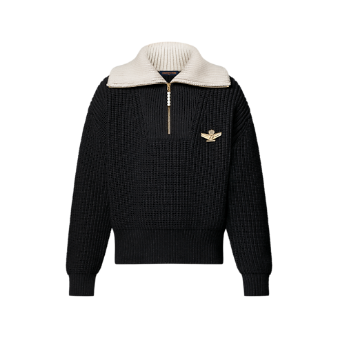 เสื้อพูลโอเวอร์ถักลายเคเบิลโอเวอร์ไซส์แต่งซิปครึ่งตัวผสานความสบายเข้ากับความสง่างาม ได้แรงบันดาลใจจากลุคนักบินสไตล์ Dandy บนรันเวย์แฟชั่นโชว์คอลเลกชันประจำฤดูกาล Spring-Summer 2025 เสื้อสีดำที่ใส่ได้หลายโอกาสรังสรรค์จากผ้าวูลผสม เสริมความโดดเด่นด้วยคอปกสีขาว ประดับเข็มกลัด LV Airways สีทองที่บริเวณอกและดีเทลไข่มุกตรงหัวซิปและข้อมือ ปิดท้ายความเรียบหรู