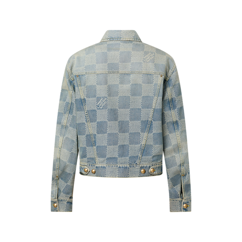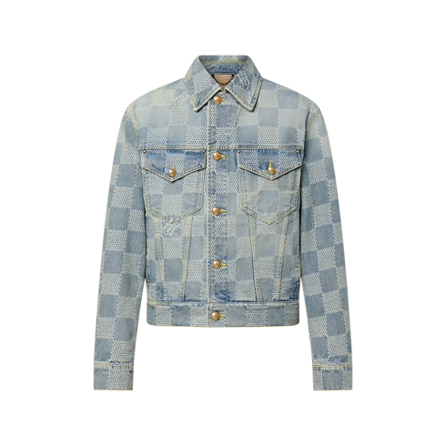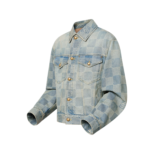เสื้อแจ็คเก็ตเดนิมคลาสสิกดีไซน์สะกดสายตา ลาย 3D Damier ทอเทคนิคแจ็คการ์ดผสานสัญลักษณ์ Marque L.Vuitton Déposée ให้เนื้อสัมผัสบางเบา ผ่านการฟอกสีน้ำเงิน Indigo และเดินตะเข็บแบบ top stitch สีเหลือง มาพร้อมดีเทลโทนสีทองแดงสไตล์วินเทจและกระดุมทรงโดม ไอเท็มตัวเก่งที่มิกซ์แอนด์แมตช์ได้หลายสไตล์ จับคู่กับกางเกงยีนส์ดีไซน์เดียวกัน ครีเอตลุคอันเป็นเอกลักษณ์โดดเด่น