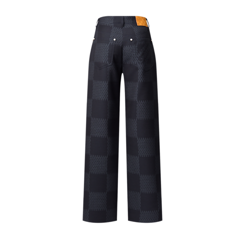 กางเกงเดนิมที่ผสมผสานความสบายและความละเอียดซับซ้อนเข้าด้วยกันอย่างลงตัว กางเกงทรงคลาสสิกแต่งกระเป๋า 5 ช่องดูดีเหนือระดับด้วยผ้าวูลแจ็คการ์ดลาย Damier ขนาดใหญ่ผสานลาย seed โทนสีกรมท่าหรูหราผสานสัญลักษณ์ ‘Marque L.Vuitton déposée’ หมุดไข่มุกและกระดุมเอฟเฟ็กต์ไข่มุกเข้ากับเสื้อแจ็คเก็ตดีไซน์เดียวกัน คอมพลีตลุคสมบูรณ์แบบ