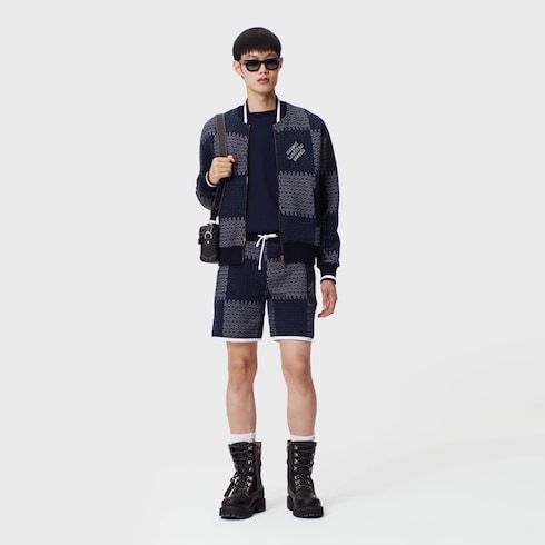 เสื้อแจ็คเก็ตบอมเบอร์ผ้าคอตตอนเจอร์ซีย์แบบควิลต์เนื้อบางเบาเหมาะสวมเป็นเสื้อตัวนอกหรูหราสำหรับฤดูร้อน โดดเด่นด้วยลาย Damier ขนาดใหญ่ทอเทคนิคแจ็คการ์ด ผสานสัญลักษณ์ ‘L.Vuitton Marque déposée’ บริเวณอกด้านซ้าย เสื้อสีน้ำเงินกรมท่าตัดกับคอเสื้อและข้อมือผ้าริบสีขาวลงตัว ไอเท็มคอนเซ็ปต์ Buy now wear now เปลี่ยนลุคให้เป็นชุดเดินทางอันไร้ที่ติเมื่อแมตช์กับกางเกงขาสั้นดีไซน์เดียวกัน