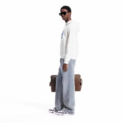 กางเกงยีนส์ขากว้างจากคอลเลกชันประจำฤดูกาล Fall-Winter 2025 ยกระดับดีไซน์ด้วยลาย Mini Damier ทั้งตัว ปักด้ายสีขาวตัดกันเป็นลวดลายกราฟิกประณีต เพิ่มสัมผัสนุ่มนวลให้กับผ้าเดนิมออร์แกนิกฟอกสี กระเป๋าแต่งหมุดเอฟเฟ็กต์ไข่มุก ประดับป้าย jacqueron หนังนูบัคลาย Mini Damier เพิ่มความเรียบหรูให้ไอเท็มเปี่ยมเอกลักษณ์ต้อนรับฤดูร้อนอย่างลงตัว