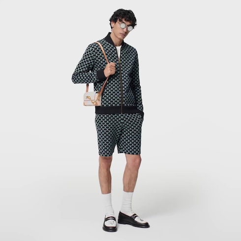 เสื้อบอมเบอร์ผ้าคอตตอนเจอร์ซีย์ทอสองด้านที่แสนหรูหรา โดดเด่นด้วยลาย LV Fishnet เทนิคแจ็คการ์ดทั่วทั้งตัว สัญลักษณ์อักษรย่อ LV สีเขียวอ่อนตัดกับพื้นหลังสีน้ำเงินเข้มชวนให้นึกถึงจักรวาลแห่งท้องทะเลของคอลเลคชั่นนี้ ด้านในทอลายเดียวด้วยสีส้มสุดคอนทราสต์ เผยให้เห็นความรู้และความชำนาญของเมซง พร้อมขับเน้นความประณีตมีระดับอย่างไร้ที่ติ เสื้อลายกราฟิกสวมแมตช์กับกางเกงขาสั้นมอบลุคร่วมสมัยลงตัว