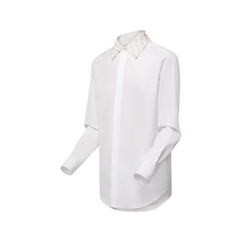 เสื้อเชิ้ตทางการมีสไตล์รังสรรค์จากผ้าคอตตอนที่ผ่านการรับรองมาตรฐาน ดีเทลปกเสื้อปักประดับลูกปัดมุกหลายขนาดอย่างพิถีพิถันสรรสร้างลาย Damier สามมิติโทนสีเดียวกัน แถบกระดุมซ่อนเรียบหรูสะท้อนเอกลักษณ์เสื้อทักซิโด้สไตล์คลาสสิก ดีเทลกระดุมคอเม็ดบนแต่งเอฟเฟ็กต์ไข่มุก เสื้อเชิ้ตไอคอนิกเติมความสง่างามให้กับลุคทางการได้อย่างสมบูรณ์แบบ