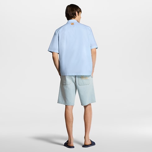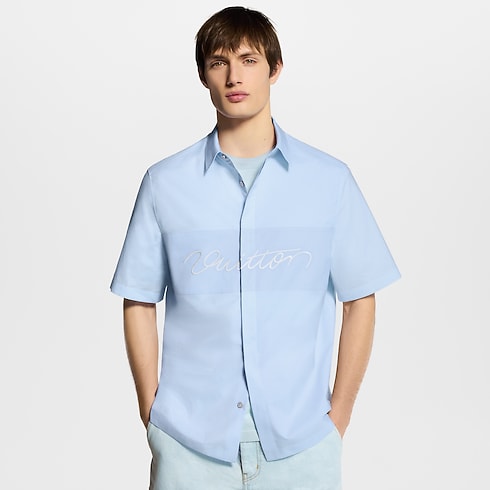 เสื้อเชิ้ตแขนสั้นผ้าคอตตอนลายตาราง gingham สีฟ้าอ่อนนำเสนอความสดใสในฤดูร้อน แถบกระดุมซ่อนสร้างเส้นสายเรียบหรูและมินิมอล คอนทราสต์กับแถบสีตัดกันปักประดับสัญลักษณ์ Vuitton แบบตัวเขียนบริเวณอก เสื้อเชิ้ตมีชีวิตชีวาและมีสไตล์ แมตช์ลุคแคชวลและเอวรี่เดย์ลุคด้วยลูกเล่นกราฟิกล้ำสมัย
