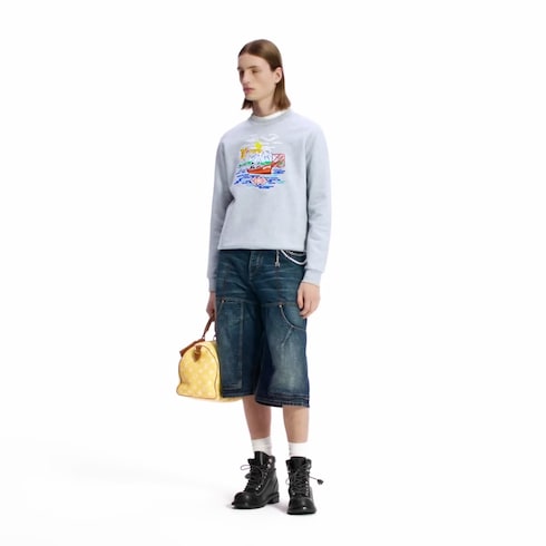 เสื้อสเวตเชิ้ตสีเทาอ่อนที่สวมใส่ได้หลากหลายโอกาส รังสรรค์จากคอตตอนเนื้อนุ่ม ประดับงานปักสีสันสดใสจากโชว์ประจำฤดูกาล Fall-Winter 2025 ลายปักอันเป็นเอกลักษณ์เฉลิมฉลองมิตรภาพยาวนานเบื้องหลังการร่วมงานของ Pharrell และ Nigo ในคอลเลกชันนี้ โดยแสดงภาพทั้งสองในเรือตกปลาท่ามกลางบรรยากาศอันเงียบสงบ ตกแต่งป้ายหนัง Marque L.Vuitton Déposée ที่ด้านหลัง เติมเต็มความสมบูรณ์แบบให้ไอเท็มสไตล์แคชวลอย่างลงตัว