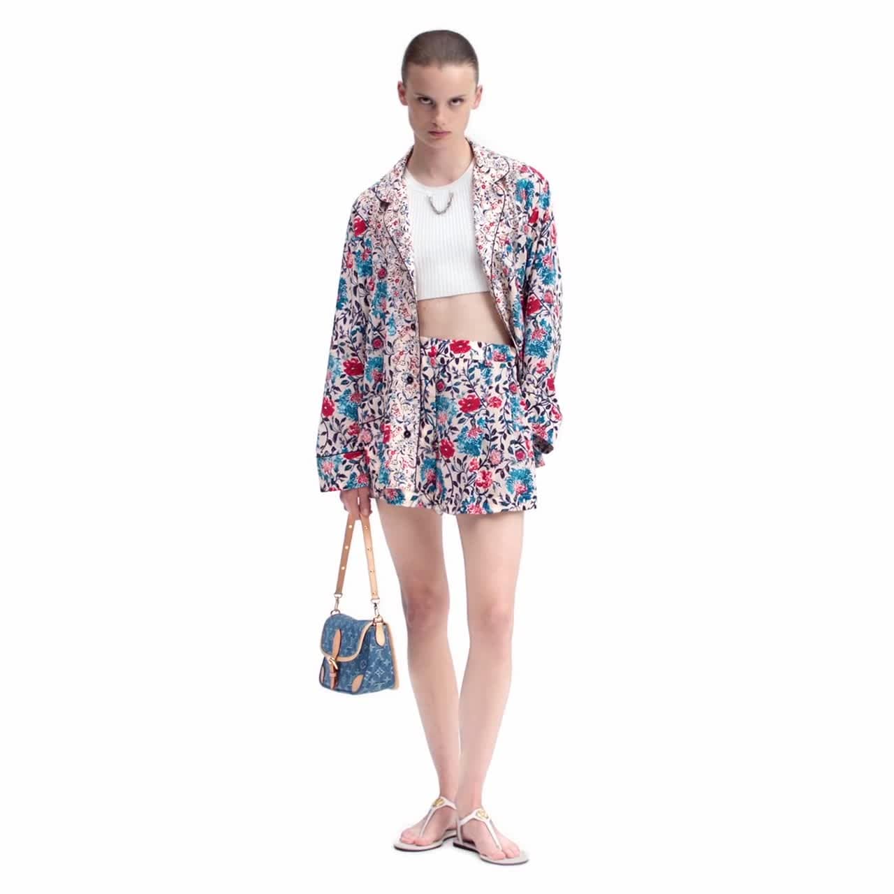 กางเกงขาสั้นสดใสเข้ากับซัมเมอร์รังสรรค์จากผ้าไหม Crepe de Chine พลิ้วไหวโปร่งสบาย พิมพ์ลาย Floral Vine ประจำฤดูกาลเด่นสะดุดตาทั้งตัว ดีเทลจับจีบด้านหน้าขับเน้นวอลลุ่มให้ช่วงขากางเกงกว้าง ซิปซ่อนด้านหน้าและกระเป๋าซ่อนด้านหลังเสริมความเรียบหรูไร้ที่ติ