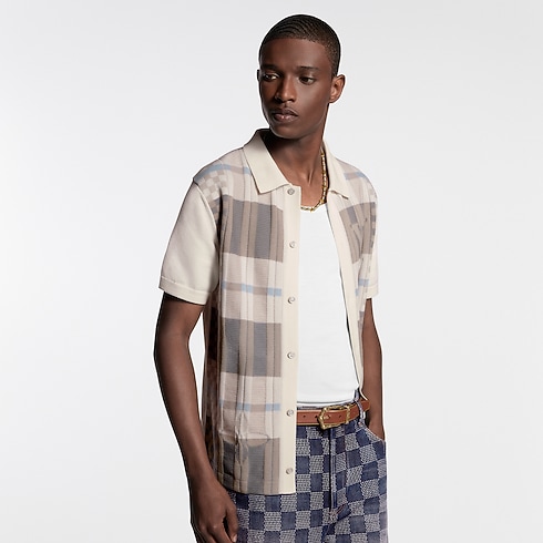 เสื้อเชิ้ตแขนสั้นผ้านิตคอตตอนคุณภาพดีด้านหน้าทอลายตารางเทคนิคแจ็คการ์ดในโทนสีเบจเรียบหรูจากโชว์คอลเลกชันประจำฤดูกาล Spring-Summer 2026 ผสานดีเทลสัญลักษณ์ของเมซงในลวดลายกลมกลืน คอปกถักสไตล์เสื้อเชิ้ตโปโลและกระดุมเอฟเฟกต์มาเธอร์ออฟเพิร์ลเพิ่มความสง่างามเหนือระดับให้กับไอเท็มเอวรี่เดย์ลุค