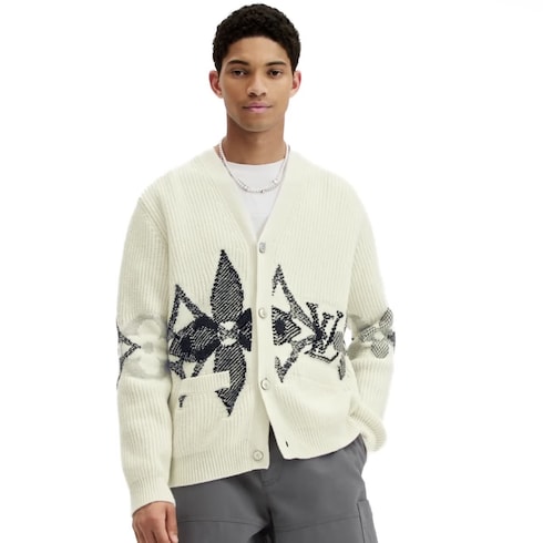 เสื้อคาร์ดิแกนผ้าวูลสำหรับฤดูหนาวโดดเด่นด้วยลายสัญลักษณ์สไตล์กราฟิก บริเวณแขนและส่วนล่างลำตัวตกแต่งลาย LV ขนาดใหญ่ซ้อนทับลาย Monogram Flower ชวนให้นึกถึงเกล็ดหิมะ ดีไซน์ผ้านิตเทคนิค Intarsia อันละเอียดอ่อนใช้การปักแบบคอนทราสต์ด้วยโทนสีเทาและสีน้ำเงินตัดกับผ้าริบสีขาวหนาคอนทราสต์เอฟเฟ็กต์เปี่ยมผิวสัมผัสหรูหรา เหมาะสำหรับสวมยามค่ำคืนผ่อนคลายที่รีสอร์ตอันอบอุ่นหลังจากเล่นสกีมาตลอดวัน