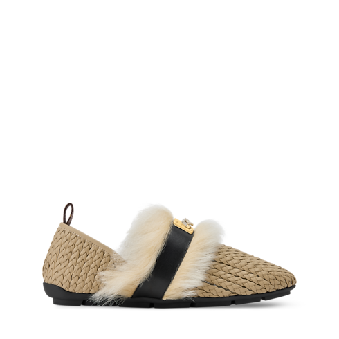 รองเท้าสวมเปิดส้นแบนรุ่น Haven รังสรรค์จากหนังลูกวัวถัก แต่งขอบหนังแกะขนฟูนุ่ม ออกแบบโดยอาร์ทิสติกไดเร็กเตอร์ของผู้หญิง Nicolas Ghesquière สำหรับคอลเลกชันประจำฤดูกาล Spring-Summer 2026 โดดเด่นด้วยสัมผัสสบาย ผสานงานฝีมือของการถักหนังบนตาข่ายอ่อนนุ่ม ประดับแอคเซสเซอรี่ Swing Lock สีทองที่ได้รับแรงบันดาลใจจากทรังก์ระดับตำนานของเมซง