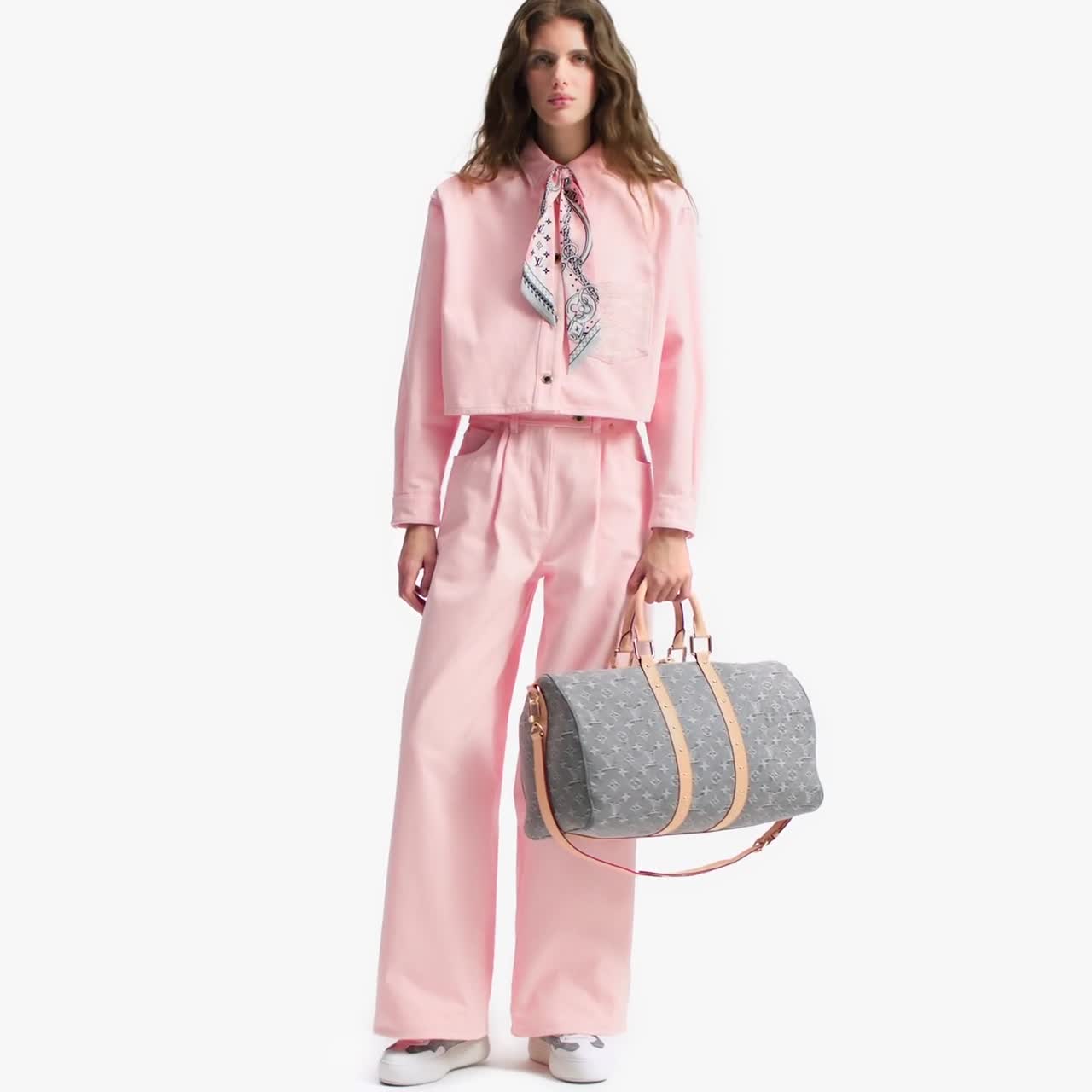 กระเป๋ารุ่น Keepall Bandoulière 45 สะท้อนความหรูหราอย่างมีระดับด้วย Monogram เดนิมคอตตอนโทนสีอ่อนซึ่งผสานเข้ากับขอบหนังคาวไฮด์ธรรมชาติและฮาร์ดแวร์สีทองอ่อนอย่างลงตัว หมุดโลหะบนแถบด้านข้างได้รับแรงบันดาลใจจากทรังก์วินเทจของเมซง มาพร้อมหูจับด้านบนและสายสะพายไหล่ที่สามารถถอดและปรับความยาวได้เพื่อความสะดวกในการพกพา