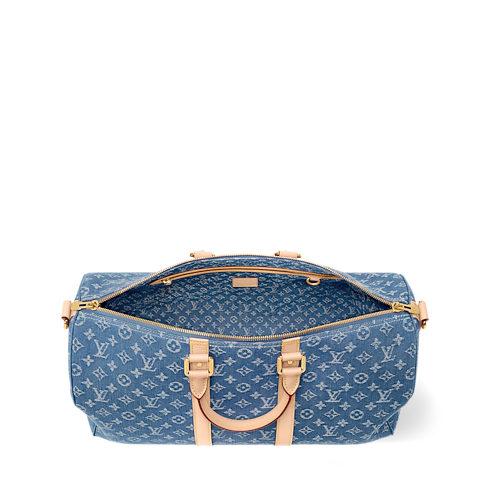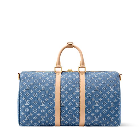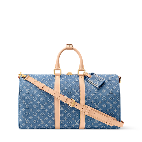 กระเป๋าเดินทางรุ่น keepall Bandoulière 45 รังสรรค์จาก Monogram เดนิมสุดไอคอนิก ผสานกับฮาร์ดแวร์สีทอง สะท้อนกลิ่นอายสตรีทแวร์ที่โดดเด่นเหนือระดับ เนมแท็กแบบถอดออกได้เอฟเฟกต์สีน้ำเงิน Denim สไตล์วินเทจ ประดับอักษรย่อ LV อันเป็นเอกลักษณ์ของเมซง กระเป๋ามีหูจับด้านบนและสายสะพายที่สามารถถอดออกและปรับความยาวได้ มอบหลากหลายทางเลือกในการพกพา