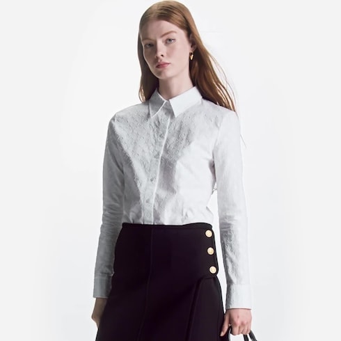 เสื้อแขนยาวทรงเข้ารูปคือทรงเสื้อเอกลักษณ์ชิ้นสำคัญประจำตู้เสื้อผ้าแนวร่วมสมัยของผู้หญิง ผ้าคอตตอนป๊อปลินเนื้อนุ่มตกแต่งด้วยลาย Monogram ที่สวยสง่าทั่วทั้งตัวซึ่งในเทคนิคการทอแบบ Fil Coupé ประดับแถบ Monogram Flower บนแขนเพื่อเติมเต็มเอกลักษณ์ของแบรนด์