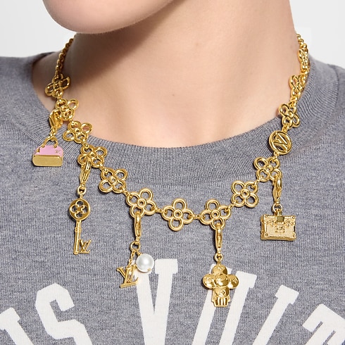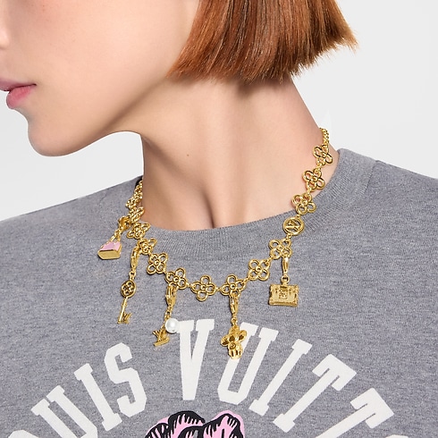 โช้คเกอร์ LV Charms ถ่ายทอดดีไซน์แบบดั้งเดิมเพื่อสะท้อนถึงสัญลักษณ์ไอคอนิกอันหรูหราแฝงความสนุกของหลุยส์ วิตตอง สายโซ่สีทองละเอียดอ่อนประดับลิงก์ Monogram Flower และชาร์ม LV Circle สร้างสรรค์ขึ้นเป็นพิเศษเพื่อร้องเรียงชาร์มแบบเกี่ยวได้จากคอลเลกชันแอคเซสเซอรี่หรูของหลุยส์ วิตตอง ผู้สวมใส่สามารถปรับแต่งสร้อยคอในแบบเฉพาะตัว สร้างลุคที่โดดเด่นไม่ซ้ำใครได้อย่างลงตัว