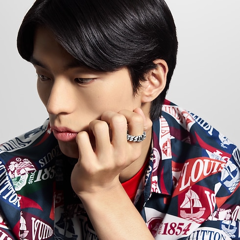 แหวนสายโซ่ LV Club ผลิตในอิตาลี แอคเซสเซอรี่ที่น่าหลงใหล ผสานความคลาสสิกเข้ากับความล้ำสมัยได้อย่างลงตัว โดดเด่นด้วยลายสลักสัญลักษณ์ LV เสริมความหรูหราให้กับดีไซน์ที่เรียงร้อยด้วยข้อต่อโซ่เงินเส้นแบนรอบตัวเรือน เคลือบพาตินาสีดำเพิ่มมิติลุ่มลึกพร้อมเสริมดีไซน์ให้ดูสง่างามสะดุดตา