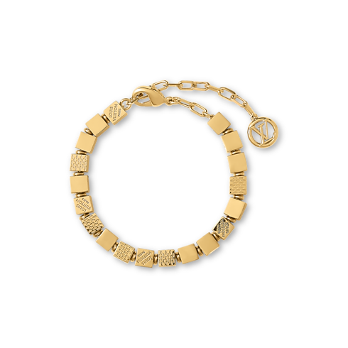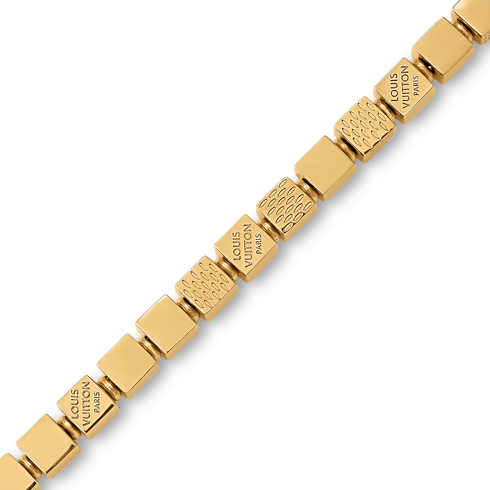 กำไลข้อมือ LV Cube รังสรรค์อย่างประณีตจากโลหะสีทอง โดยได้แรงบันดาลใจจากลวดลาย Damier อันเลอค่าและเกมปริศนา Pateki ที่ออกแบบโดย Gaston Vuitton ในปี 1932 ลูกบาศก์แต่ละชิ้นเชื่อมต่อกันอย่างประณีต พร้อมสลักลายเส้นสไตล์ Damier แคนวาสและสัญลักษณ์ Louis Vuitton Paris เพื่อเติมเต็มกลิ่นอายอันเป็นเอกลักษณ์ของเมซง และเพิ่มเสน่ห์แห่งความสง่างามและสนุกสนานให้กับทุกลุค