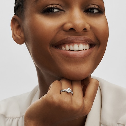 เพชรเม็ดกลางประดับบนฐานเพชร Monogram Flower ฝังหุ้มแบบ Pavé เจียระไนเป็นกลีบดอกไม้เล่นกับแสง เสริมให้เพชรส่องประกายสะดุดตา มาพร้อม LV Diamonds Certificate ซึ่งเป็นเอกสารดิจิทัลที่ไม่สามารถเปลี่ยนแปลงได้ โดยระบุคุณลักษณะระดับของเพชรเม็ดกลางและประวัติการเดินทางของเพชร ตั้งแต่การสกัดจนถึงการฝังประดับเป็นจิวเวลรี่ในขั้นตอนสุดท้าย ใบรับรองนี้จะถูกเก็บรักษาอย่างปลอดภัยด้วยเทคโนโลยีของ Aura Blockchain Consortium นอกจากนี้สามารถสลักวันที่ ข้อความ หรืออักษรย่อของคุณได้ตามต้องการ