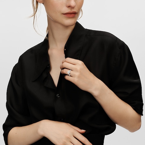 แหวน LV Diamonds Pavé Solitaire แสดงให้เห็นถึงความชำนาญในการรังสรรค์จิวเวลรี่อันเป็นเลิศของเมซง ผลงานสร้างสรรค์ที่เปี่ยมล้นไปด้วยแรงบันดาลใจ สื่อถึงพลังและอารมณ์ความรู้สึกที่สอดประสานกันอย่างใกล้ชิด แหวนแพลทินัม 950 ฝังเพชรแบบ Pavé หรูหรา เพชรเม็ดกลางเจียระไนรูป LV Monogram Star เผยความระยิบระยับเหนือระดับด้วยประกายเพชร 53 เหลี่ยมและทรงปลายแหลมที่ชวนให้นึกถึง Monogram Flower รูปดาว สัญลักษณ์ไอคอนิกแห่งเมซงที่ออกแบบโดย Georges Vuitton ในปี 1896