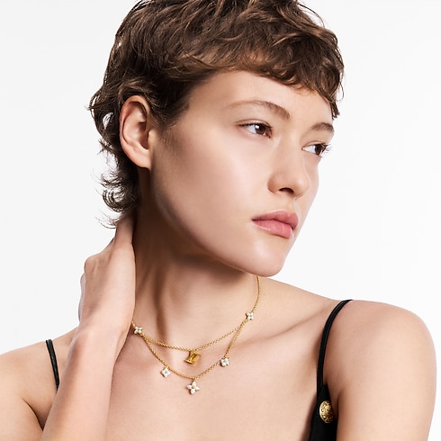สร้อยคอ LV Floragram แบบซ้อนกัน 2 เส้นเสริมให้สัญลักษณ์ไอคอนิก 2 อย่างของเมซงเปล่งประกายงดงาม ในเวลาเดียวกันผ่านงานดีไซน์ประณีต สร้อยเส้นบนประดับชาร์มอักษรย่อ LV ส่วนเส้นล่างประดับชาร์ม Monogram Flower ลูกปัดเรซินเอฟเฟ็กต์ไข่มุกเงางามเป็นกลีบดอกไม้ละเอียดอ่อน การเลือกใช้วัสดุผสมที่หลากหลายสร้างเอฟเฟ็กต์สามมิติที่สะท้อนถึงความชำนาญด้านงานฝีมือของเมซง