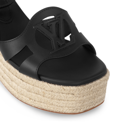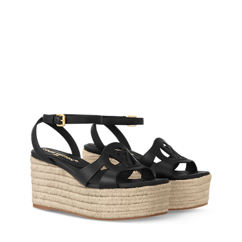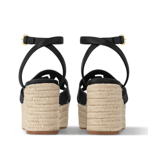 รองเท้าแซนเดิลส้นเตารีดรุ่น LV Isola หนังลูกวัวผิวเรียบแสนประณีตให้ลุคผ่อนคลาย ด้านบนประดับสัญลักษณ์ LV Circle รองเท้าสวมใส่ง่ายเป็นพิเศษด้วยส้นหนาแบบแพลตฟอร์มแต่งเชือกถักธรรมชาติที่ได้แรงบันดาลใจมาจากรองเท้าเอสปาดริลสุดคลาสสิก สายรัดข้อเท้าประดับบัคเคิลสีทองขนาดเล็กกระชับพอดีข้อเท้า