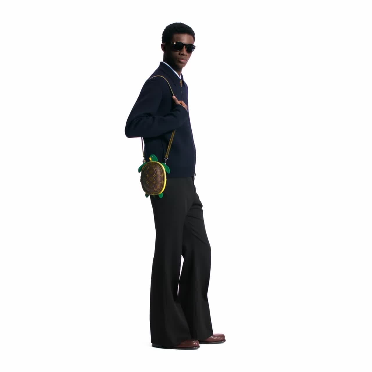 กระเป๋าสตางค์แบบสะพายรุ่น LV Turtle ใบโปรดของ Pharrell Williams รังสรรค์ลำตัวเต่าจากหนังสีเขียวและสีเหลืองเสริมแต่งกระดองลาย Monogram ดีไซน์แบบสะพายเฉียงในขนาดใส่โทรศัพท์ได้พอดีสไตล์แคชวล มาพร้อมสายสะพายปรับความยาวและถอดออกได้ทำให้ไอเท็มนำแฟชั่นใบนี้ทั้งใช้ประโยชน์ได้หลากหลายและดูสนุกสนานไปพร้อมกัน