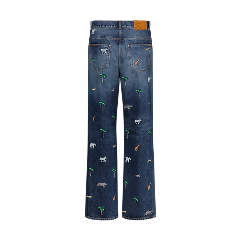 กางเกงเดนิมทรง Skate พร้อมกราฟิก LV x The Darjeeling Limited สุดไอคอนิกจากแฟชั่นโชว์คอลเลกชันประจำฤดูกาล Spring-Summer 2026 โดดเด่นด้วยลายปักสีสันสดใสรูปต้นปาล์มและสัตว์นานาชนิดทั้งตัว กระเป๋าหลังด้านขวาปักสัญลักษณ์ L.V.M. และป้ายหนังนูบัค jacqueron ลาย Mini Damier ครีเอตโททัลลุคสมบูรณ์แบบได้เพียงนำไปแมตช์กับเสื้อเชิ้ตเข้าชุดกัน