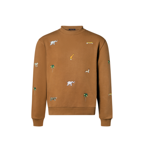 เสื้อคอกลมผ้าคอตตอนออร์แกนิกเนื้อนุ่มสไตล์แคชวลตกแต่งลาย Louis Vuitton x The Darjeeling Limited สุดไอคอนิกจากแฟชั่นโชว์คอลเลกชันประจำฤดูกาล Spring-Summer 2026 ทั่วทั้งตัว ลายปักแสนประณีตถ่ายทอดภาพต้นปาล์มและสัตว์นานาชนิดลงบนพื้นหลังโทนสีน้ำตาลคาราเมลอันอบอุ่น แต่งแต้มดีเทลกราฟิกให้กับเอวรี่เดย์ลุค เชิดชูศิลปะแห่งการเดินทาง