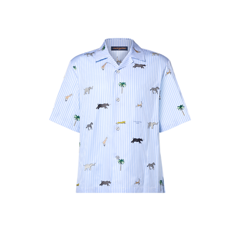 เสื้อเชิ้ตแขนสั้นลายทางสีฟ้าอ่อนและสีขาวตกแต่งลาย LV x The Darjeeling Limited จากแฟชั่นโชว์คอลเลกชันประจำฤดูกาล Spring-Summer 2026 ลายปักดอกไม้และสัตว์ทั่วทั้งตัวที่สะท้อนกลิ่นอายแห่งวันวานเฉลิมฉลองให้กับศิลปะแห่งการเดินทาง ด้านหน้าปักตัวอักษร Louis Vuitton Paris อย่างกลมกลืน เติมเต็มลุคสดใสรับซัมเมอร์ได้เพียงแค่สวมคู่กับกางเกงขาสั้นที่เข้าชุดกัน