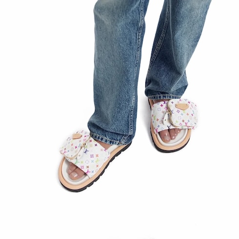 รองเท้าสวมเปิดส้นแบนรุ่น Pool Pillow จากคอลเลคชั่นการร่วมมือกันระหว่าง Louis Vuitton x Murakami เผยความโดดเด่นร่วมสมัยด้วยสายคาดแถบกว้างประดับแถบเวลโครบุนวมแต่งซิปเพาช์ ยกระดับลาย Monogram ด้วยโทนสีสดใสมีชีวิตชีวาที่ได้แรงบันดาลใจจากความงามของสีสัน Multicolor อันเป็นเอกลักษณ์ของ Takashi Murakami ศิลปินชาวญี่ปุ่น พื้นรองเท้าด้านในรองรับสรีระและพื้นรองเท้าด้านนอกมีดอกยางน้ำหนักเบา มอบลุคแคชวลสวมสบายมีระดับ