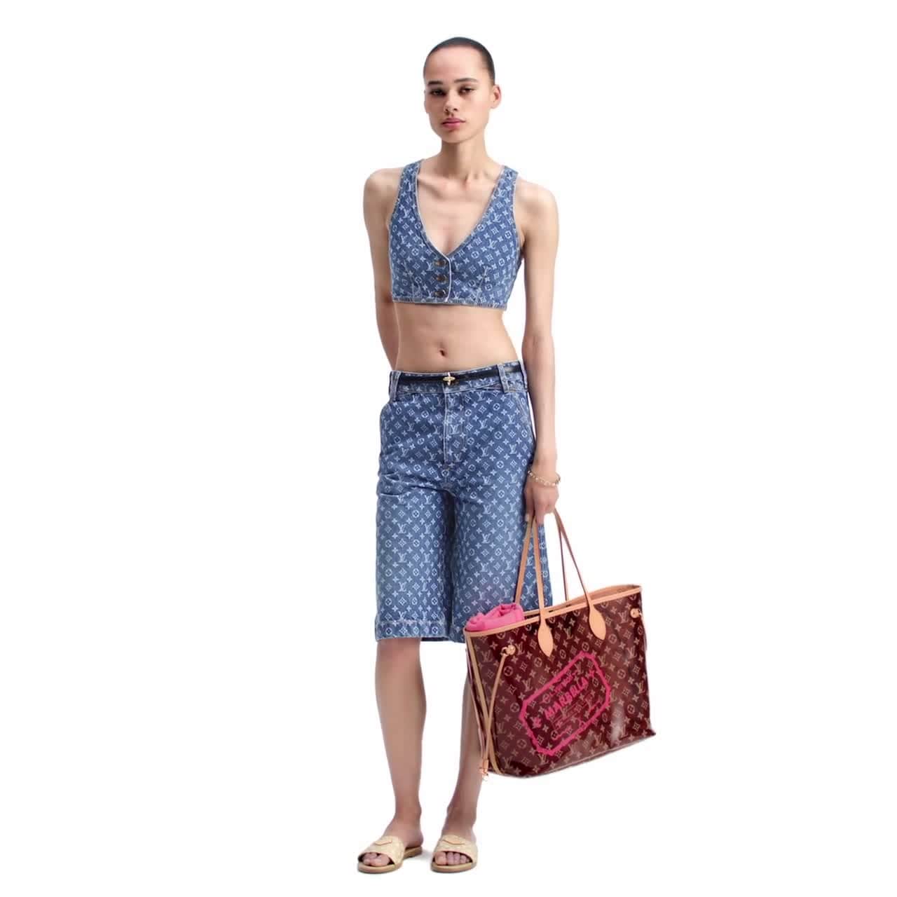เสื้อครอปคอวีทรงเข้ารูปสุดชิคผ้าเดนิมลาย Monogram โดดเด่นทั้งตัวมอบลุคแคชวลมีเอกลักษณ์ โครงเสื้อเย็บตะเข็บสีเหลืองตัดกับเดนิม บริเวณอกตกแต่งกระดุมสลักสัญลักษณ์หลุยส์ วิตตอง 3 เม็ด ด้านหลังแต่งแถบหนังธรรมชาติที่สามารถปรับให้พอดีตัวสง่างาม