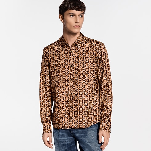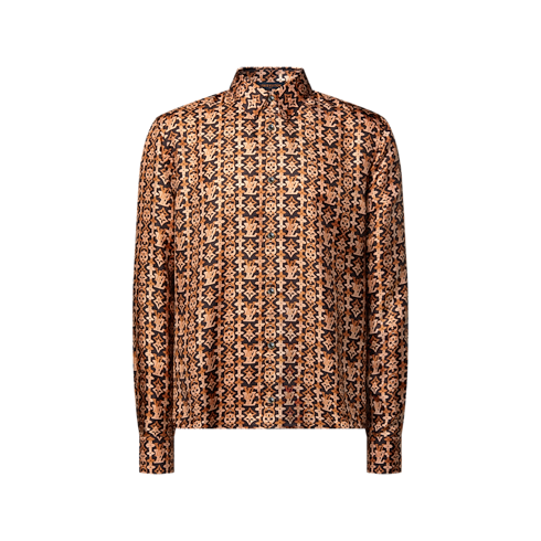 เสื้อเชิ้ตผ้าไหมออร์แกนิกพลิ้วไหวโทนสีน้ำตาลหรูหราซึ่งสะท้อนกลิ่นอายประวัติศาสตร์ของหลุยส์ วิตตอง ลายกราฟิกMonogram Overlap จากแฟชั่นโชว์ประจำฤดูกาล Spring-Summer 2026 และตกแต่งกระดุมที่เปล่งประกายราวกับอัญมณีไทเกอร์อายแสนประณีต ผลงานหรูหราเติมเต็มสไตล์ด้วยสัญลักษณ์อันโดดเด่นมีระดับ