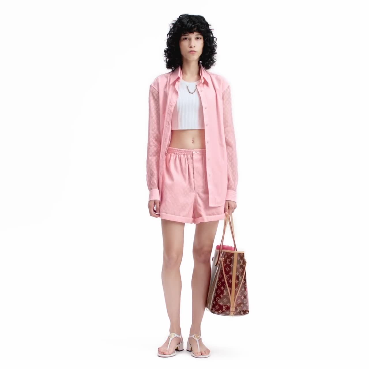 เสื้อเชิ้ตกระดุมหน้าคลาสสิกเสริมดีเทลประณีตเติมกลิ่นอายฤดูร้อน ไอเท็มพอดีตัวผ้าคอตตอนผสมผ้าไหมผิวสัมผัสประณีต แขนเสื้อแต่งผ้าโปร่งลาย Monogram เทคนิค Fil Coupé เพิ่มมิติงดงาม คอปกประดับกระดุมมาเธอร์ออฟเพิร์ลสำหรับถอดปกเสื้อออกเพื่อปรับรูปทรงให้ดูเรียบหรู บริเวณอกตกแต่งอักษรย่อ LV สุดไอคอนิกกลมกลืน
