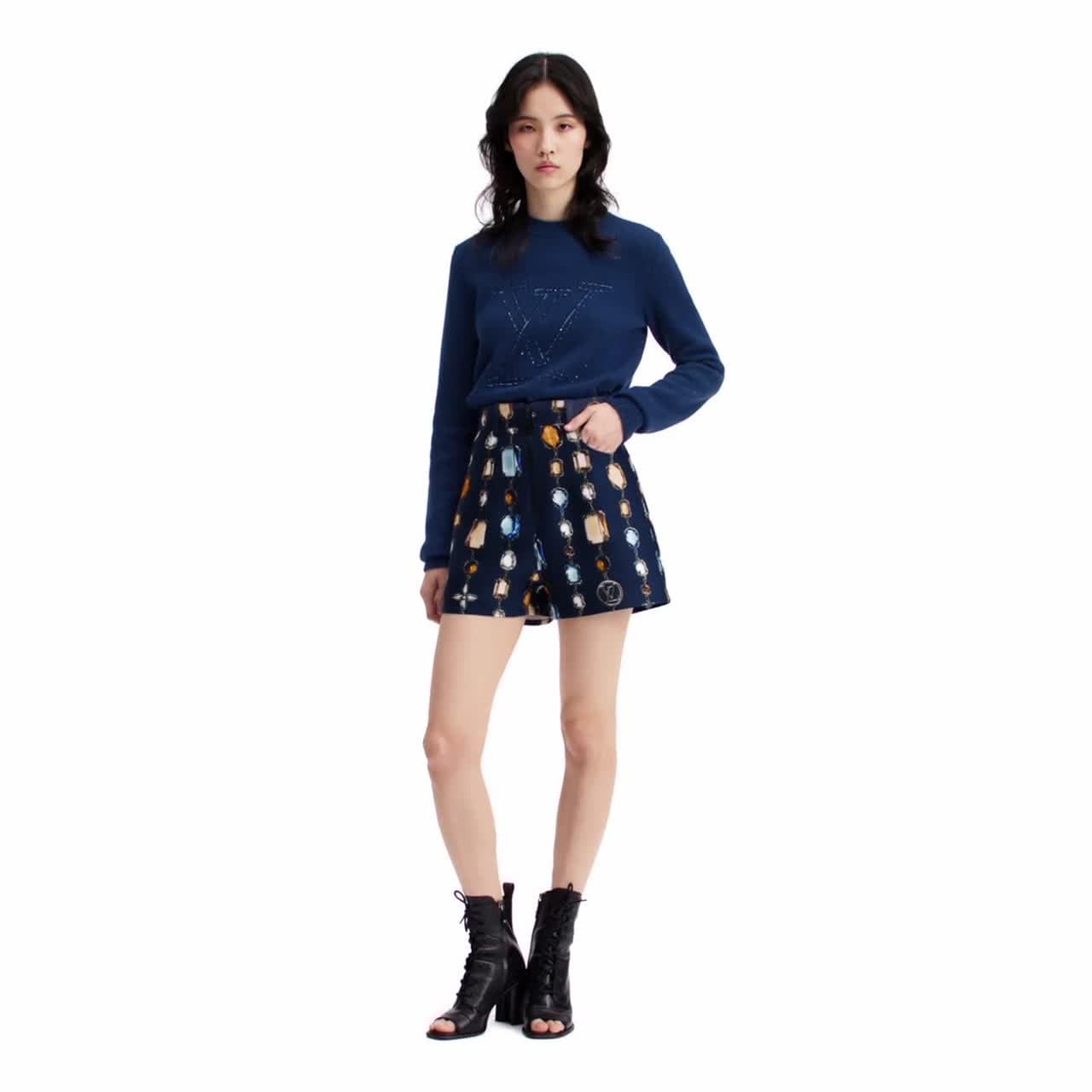 กางเกงขาสั้นสุดชิคถ่ายทอดความหรูหรามีระดับด้วยผ้าไหม Mikado ผสมผ้าวูล พิมพ์ลวดลาย necklace ประจำฤดูกาลอันโดดเด่น สะท้อนความงดงามของชาร์มสัญลักษณ์หลุยส์ วิตตองผสานอัญมณีหลากสีอย่างมีชีวิตชีวา กางเกงรูปทรงประณีต มาพร้อมดีเทลซิปด้านหน้าที่เสริมกลิ่นอายร่วมสมัยให้กับดีไซน์โดยรวมได้อย่างลงตัว
