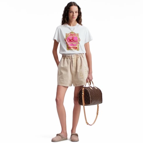 เสื้อยืดโดดเด่นด้วยลายพิมพ์สีสันสดใสขนาดใหญ่บริเวณอก ในรูปแบบตราประทับการเดินทางสไตล์เรโทรผสานการตกแต่งดีเทลลาย Parrot แสนสดใสเคียงคู่สัญลักษณ์ Louis Vuitton Paris เสื้อยืดผ้าคอตตอนเจอร์ซีย์เนื้อนุ่มเข้ารูปสไตล์แคชวล คอเสื้อประดับสายโซ่ LV ลงตัว