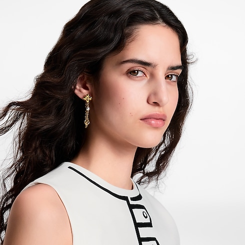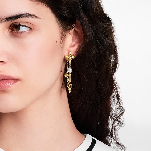 ต่างหู Pearl Constellation ดีไซน์อสมมาตรละเอียดอ่อน ถ่ายทอดมนต์เสน่ห์ของท้องฟ้ายามค่ำคืนที่พร่างพราวด้วยหมู่ดาว ต่างหูแต่ละข้างผสมผสาน Monogram Flower สองชิ้นและสัญลักษณ์ LV Circle เข้ากับไข่มุกเรซินแวววาวที่เรียงรายบนสายโซ่สีทองอ่อน เครื่องประดับสไตล์เฟมินีนหรูหราเพิ่มเสน่ห์ความเปล่งประกายแห่งจักรวาลให้กับทุกลุค