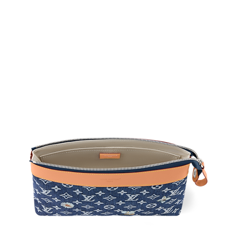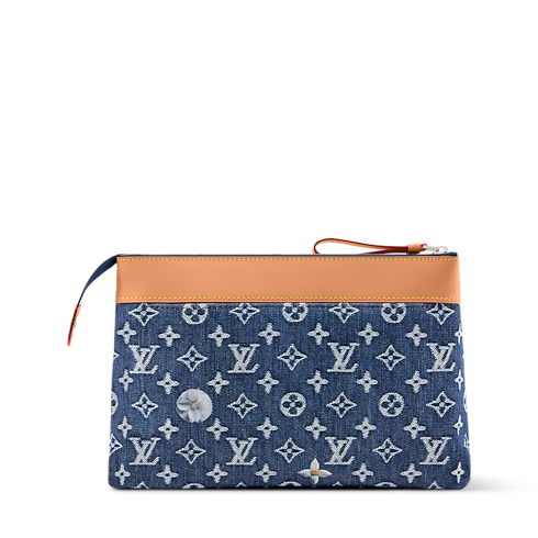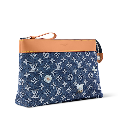 กระเป๋ารุ่น pochette Voyage Souple ผลงานผ้าเดนิมทอเทคนิคแจ็คการ์ด ลาย Monogram ที่ถักทอลงบนเนื้อผ้าเส้นด้ายต่อเส้นด้ายสะท้อนเอฟเฟกต์ทูโทนสีขาวและสีน้ำเงิน Indigo แต่งแต้มความหรูหราด้วยลายดอกไม้สีขาวปักประณีต กระเป๋าออกแบบมาเพื่อพกพาของใช้จำเป็นในแต่ละวัน โดยมีช่องกระเป๋าหลักมาพร้อมซิปเพื่อความปลอดภัย