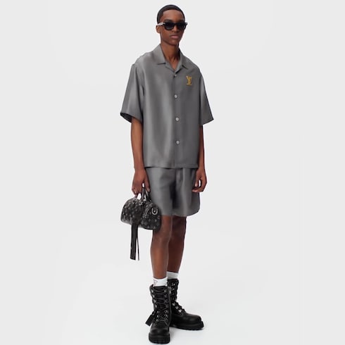 เสื้อเชิ้ตแขนสั้นผ้าไหมออร์แกนิกเนื้อนุ่มลื่นสีเทาเมทัลลิกแวววาว ดีไซน์คอปกแบบเปิดสวมสบายสำหรับฤดูร้อน โดดเด่นด้วยสัญลักษณ์ LV Ropes ที่ได้แรงบันดาลใจจากเชือกในแฟชั่นโชว์คอลเลคชั่นประจำฤดูกาล Fall-Winter 2024 โดยพิมพ์สัญลักษณ์ LV บริเวณอก ด้านหลังแต่งลาย LV Lovers กระดุมมาเธอร์ออฟเพิร์ลขับเน้นความหรูหราให้สวมใส่ได้ตั้งแต่เช้าจรดค่ำ แมตช์กับกางเกงขาสั้นดีไซน์เดียวกันเติมเต็มลุคโดดเด่น