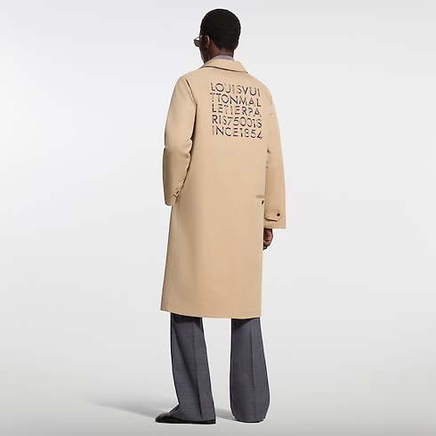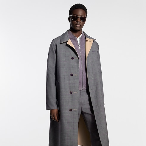 เสื้อเทรนช์โค้ทผ้าคอตตอนผสมผ้าไหมน้ำหนักเบา สวมใส่ได้หลากหลายสไตล์ ด้านนอกเผยสีเบจคลาสสิก คอนทราสต์กับดีไซน์ด้านหน้าสุดเรียบหรู โดดเด่นด้วยตัวอักษรกราฟิก LV Alphabet ประจำฤดูกาลที่ด้านหลัง เมื่อพลิกกลับด้านจะเผยให้เห็นลายตารางเทคนิคแจ็คการ์ดในสีเทา ตกแต่งลายปักสัญลักษณ์อย่างประณีตบริเวณหน้าอก รูปทรงเรียบง่ายลงตัวกับการแต่งกายช่วงเปลี่ยนผ่านฤดูกาลอย่างไร้ที่ติ