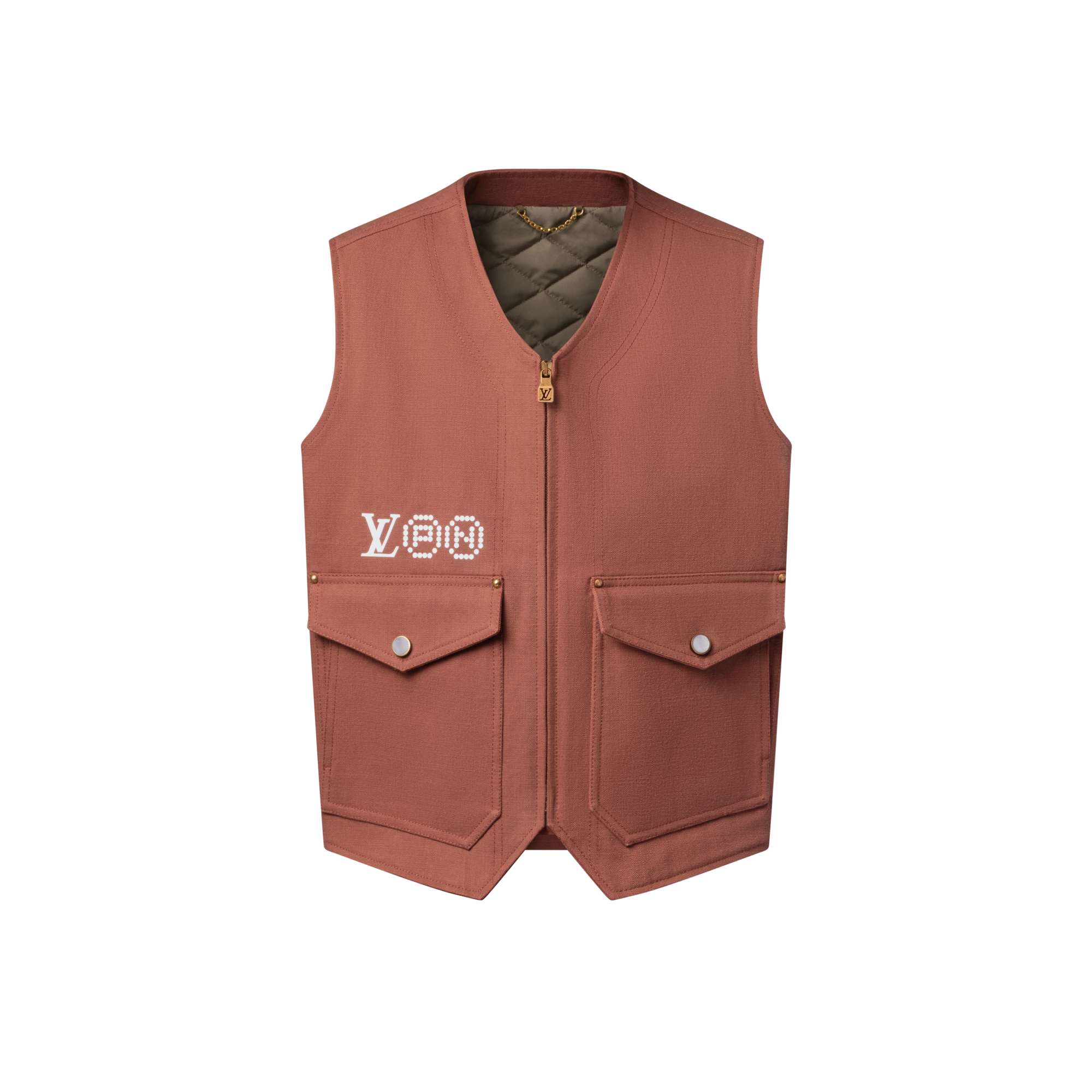 เสื้อแจ็คเก็ตสุดเอ็กซ์คลูซีฟรังสรรค์จากผ้าแจ็คการ์ดเรียบหรูคล้ายผ้าทอ ดีไซน์เสื้อปักเลื่อมลายกราฟิก LV Camo ประจำแฟชั่นโชว์คอลเลกชันประจำฤดูกาล Fall-Winter 2025 ซึ่งผสานสัญลักษณ์ Monogram โทนสีเทา Graphite และสีส้ม Terracotta เข้าด้วยกัน มีดีเทลสไตล์ Workwear อย่างคอเสื้อหนังแบบริบเอฟเฟ็กต์ผ้าลูกฟูกและกระเป๋าแบบแพตช์ตกแต่งหมุดสีเงิน ด้านหน้าประดับแพตช์หนัง Marque L.Vuitton Déposée คอมพลีตลุคด้วยซับในบุนวมแบบควิลต์