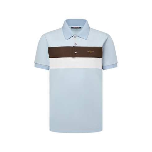 เสื้อโปโลสุดประณีตรังสรรค์จากผ้าคอตตอนปีเก้สีฟ้าอ่อน ช่วงลำตัวตกแต่งแถบแนวนอนสีน้ำตาลและสีขาวดูตัดกันอย่างมีสไตล์บริเวณ เสริมดีเทลสุดหรูบนหน้าอกด้วยลายประทับ Louis Vuitton Paris สีทอง ขณะที่แพตช์หนังประทับสัญลักษณ์ Marque L.Vuitton Déposée ที่ด้านหลังเติมเต็มกลิ่นอายแห่งความสง่างามในสไตล์ Preppy ได้อย่างลงตัว