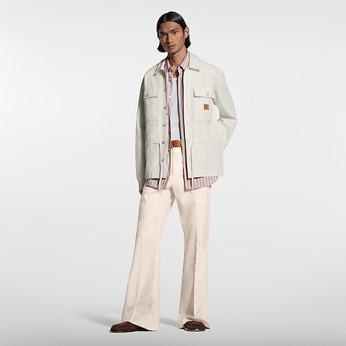 เสื้อโอเวอร์เชิ้ตผ้าคอตตอนออร์แกนิกสะท้อนอารมณ์ของแฟชั่นโชว์ประจำฤดูกาล Spring-Summer 2026 ด้วยความสง่างามที่เปี่ยมด้วยความผ่อนคลาย ไอเท็มอเนกประสงค์สำหรับลุคเลเยอร์ที่หลากหลาย มาพร้อมลายแจ็คการ์ด chevron ในโทนสีเบจ Greige กระเป๋าแบบมีฝาพับบริเวณอกทั้งสองข้าง และเชือกผูกเอว เพิ่มความโดดเด่นด้วยแพตช์หนังประทับสัญลักษณ์ที่กระเป๋าซ้าย พร้อมลายพิมพ์โลโก้ Vuitton ด้านหลังที่เพิ่มมิติกราฟิกอย่างมีสไตล์