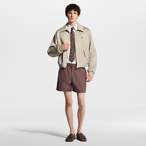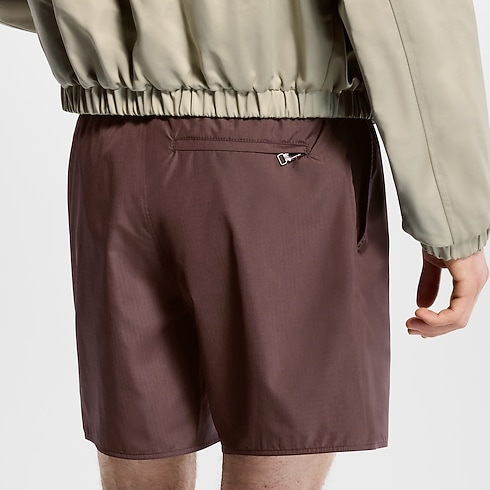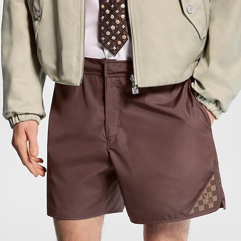 กางเกงว่ายน้ำสีน้ำตาลเข้มผ้า Ripstop เทคนิคอลคุณภาพเยี่ยม เติมเต็มบรรยากาศแห่งความหรูหราริมสระว่ายน้ำ ไอเท็มดีไซน์มินิมอลประดับแพตช์ซิลิโคน Damier Heritage และตัวอักษร LV สามมิติที่ขากางเกงด้านซ้าย มาพร้อมกระเป๋าแบบอิตาเลียนและซิปสวมสบาย กางเกงขาสั้นแมตช์กับลุคแคชวลและลุคสปอร์ตในวันว่างได้อย่างมีสไตล์