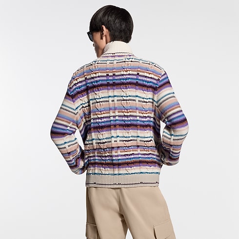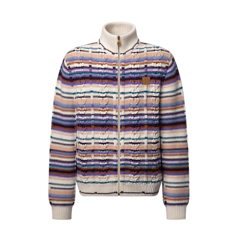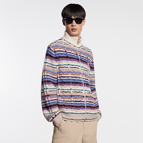 เสื้อวอร์มผ้าวูล-แคชเมียร์หรูหราโดดเด่นในดีไซน์ที่ดูราวกับสร้างสรรค์โดยช่างฝีมือ ผสมผสานลายทางสีสันสดใสเข้ากับผ้าถักลายเคเบิลที่มีมิติ มาพร้อมซิปหน้าและคอปกตั้ง สามารถสวมเป็นเสื้อคาร์ดิแกนหรือเลเยอร์ชั้นนอกแบบบางเบาในวันฤดูใบไม้ผลิที่อากาศอบอุ่น บริเวณอกตกแต่งแพตช์หนังสัญลักษณ์เมซงเติมความสง่างาม