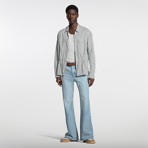 เสื้อโอเวอร์เชิ้ตผ้าคอตตอนออร์แกนิกทอแจ็คการ์ดลายทางในโทนสีฟ้านุ่มนวล ไอเท็มเลเยอร์อเนกประสงค์สำหรับซีซั่นนี้เผยความหรูหราและผ่อนคลาย ตัวเสื้อมาพร้อมกระเป๋าอกแบบมีฝาพับติดทั้งกระดุมสองข้าง และช่วงเอวแต่งเชือกรูด เสริมเสน่ห์ด้วยลายพิมพ์ L.V.M. Legacy อันเป็นเอกลักษณ์บริเวณด้านหลัง กระดุมเอฟเฟ็กต์มาเธอร์ออฟเพิร์ลช่วยเติมเต็มความหรูหราอย่างลงตัว