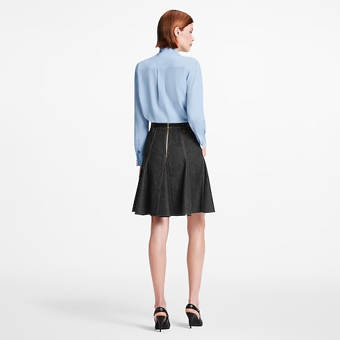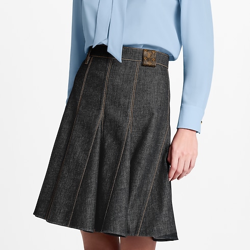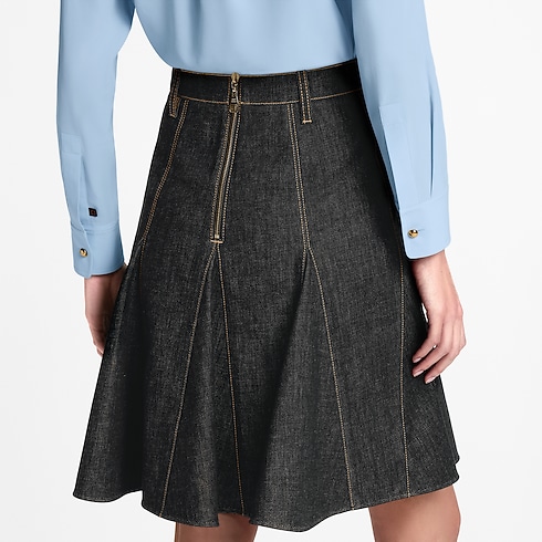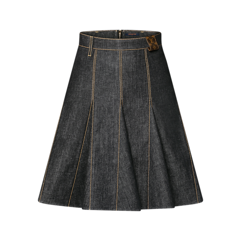 กระโปรงรังสรรค์จากผ้าเดนิมสีน้ำเงินเข้มโดดเด่นด้วยการเดินตะเข็บแบบ top stitch สีเหลืองตัดกัน ให้ลุคแบบมีโครงสร้างเหนือกาลเวลา พร้อมแต่งดีเทลการตัดต่อแบบ Godet เสริมรูปทรงให้มีวอลลุ่มสุดชิค ขอบเอวตกแต่งห่วงเข็มขัด Monogram แคนวาส เติมเอกลักษณ์ทันสมัย ปิดท้ายด้วยด้านหลังแต่งซิปตลอดตัวเพิ่มความหรูหรามีระดับ