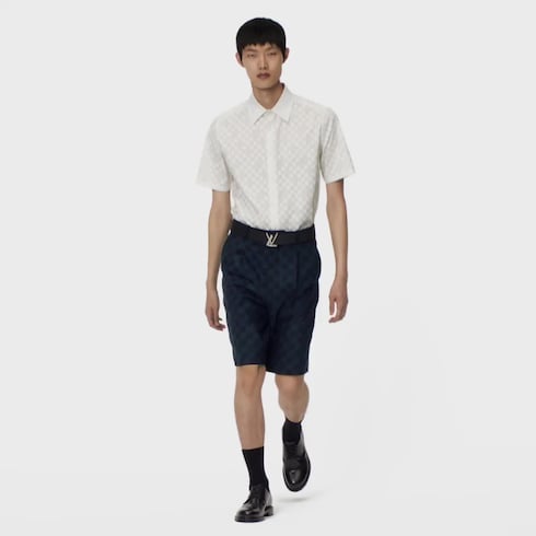 กางเกงขาสั้นจับจีบด้านหน้า ตัวเลือกสมบูรณ์แบบสำหรับวันที่อากาศอบอุ่น ผลงานจากผ้าวูลยืดหยุ่นบางเบาทอลาย Wavy Damier เทคนิคแจ็คการ์ดทั้งตัวผสานสัญลักษณ์ LV โทนสีน้ำเงินและสีดำที่เป็นการตีความสัญลักษณ์ซึ่งสืบทอดจากรุ่นสู่รุ่นของเมซงขึ้นใหม่ ไอเท็มที่สวมแมตช์กับเสื้อแจ็คเก็ต Napolitana กลายเป็นชุดสูทฤดูร้อนร่วมสมัย